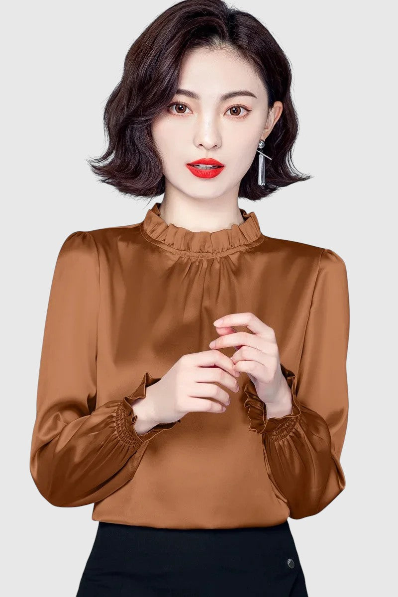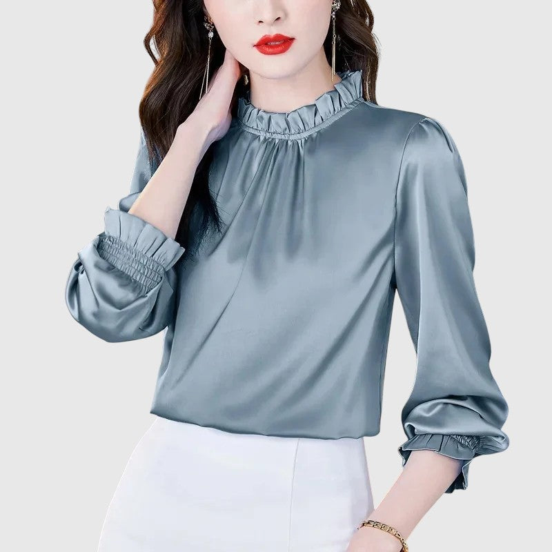• Zvrásnené detaily na golieri a manžetách, ktoré dodávajú romantický a rafinovaný nádych.
