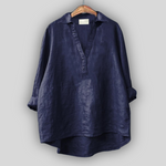 Elegantná ľanová blúzka v čistej bielej farbe, ktorá vyžaruje sviežosť a nadčasový štýl. Disponuje V-čkovým výstrihom s diskrétnou légou, dlhými rukávmi, ktoré je možné vyhrnúť, a asymetrickým lemom s dlhšou zadnou časťou, čo zabezpečuje komfort a voľnosť pohybu. Ideálny výber na chladnejšie letné outfity alebo elegantný neformálny vzhľad.