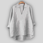 Elegantná ľanová blúzka, ktorá vyžaruje minimalistickú eleganciu a nadčasový štýl. Hlboký V-krk s elegantným golierom dodáva moderný vzhľad, zatiaľ čo voľný strih zabezpečuje komfort a ľahký pohyb. Asymetrický strih s dlhšou zadnou časťou dopĺňa elegantnú estetiku.