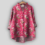 Romantická ľanová blúzka v intenzívne ružovej farbe s kvetinovým vzorom ruží, ktorá vyžaruje ženskosť a eleganciu. V-krčný výstrih s jemnými volánmi a voľný siluet zabezpečujú pohodlie a vzdušný pocit, zatiaľ čo asymetrický lem s dlhšou zadnou časťou pridáva moderný charakter každému outfitu.