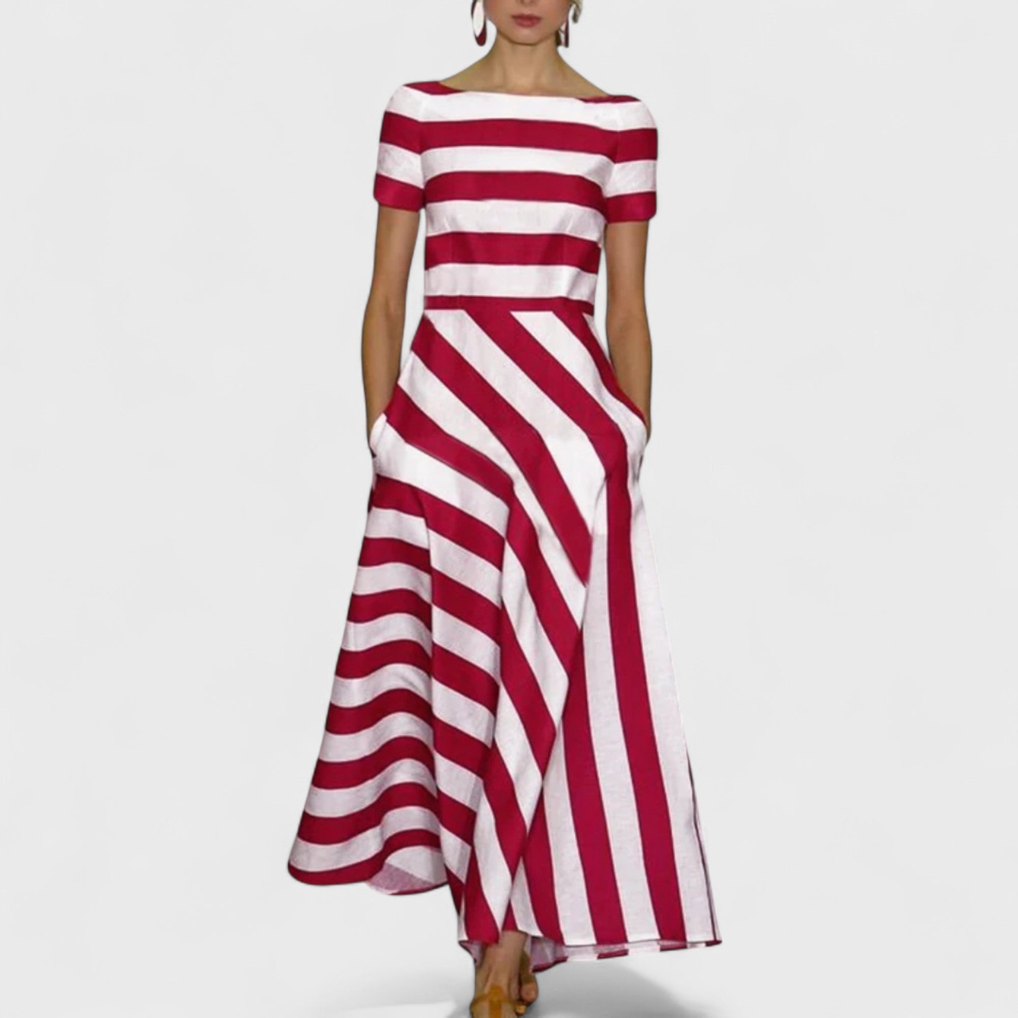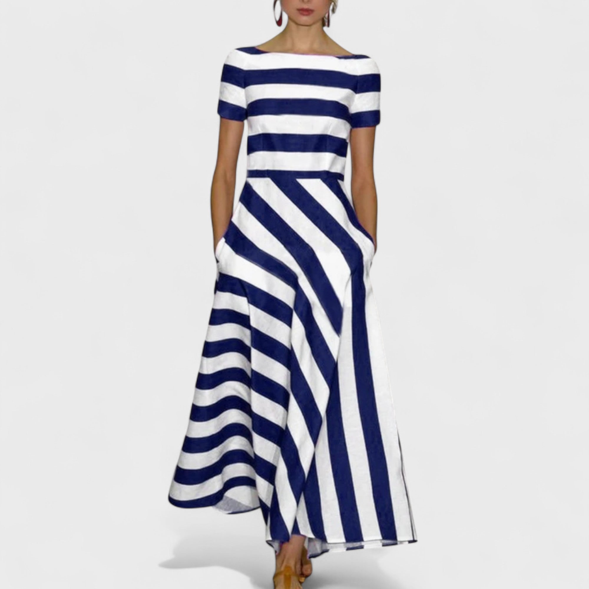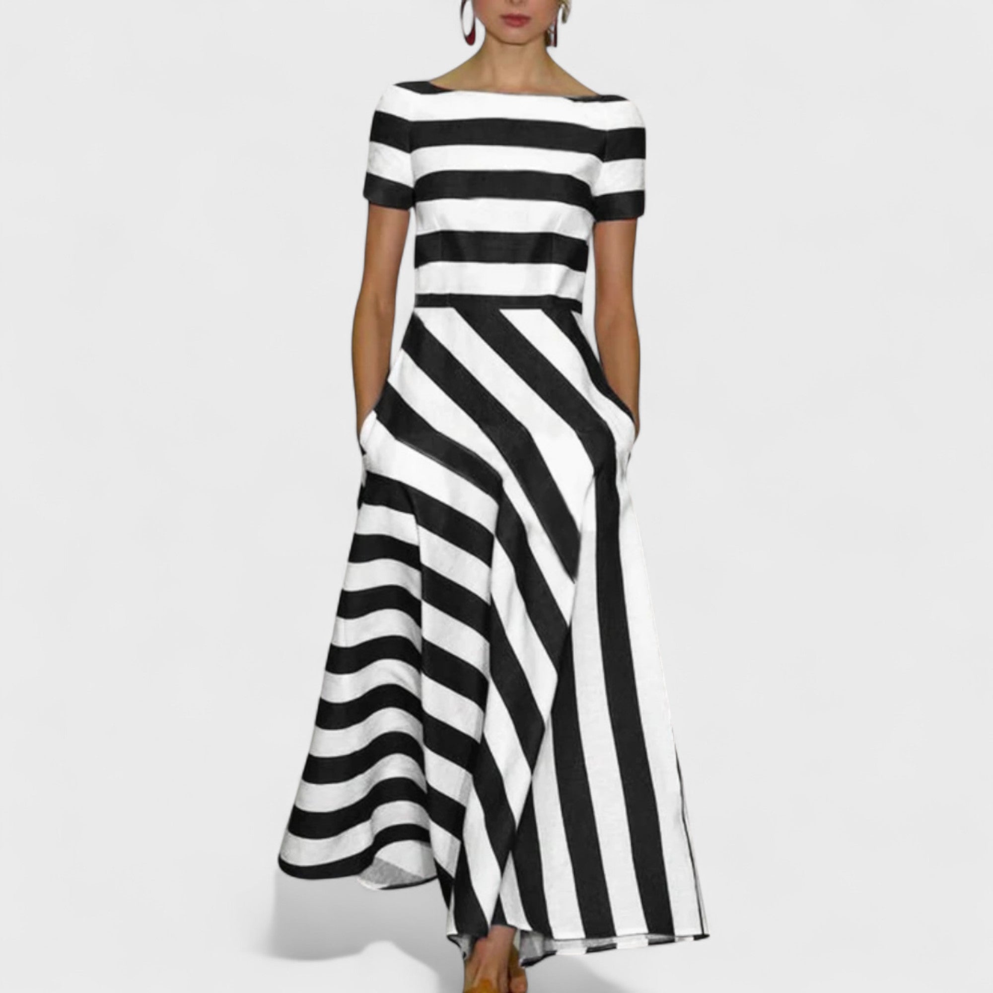 • Vrstevnaté pruhy & priliehavý pás – opticky zužuje siluetu a pridáva jemnú grafickú eleganciu bez zbytočného hluku.