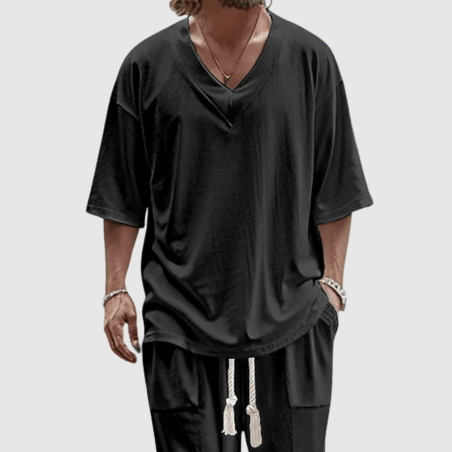 Táto pánska sada ponúka nové dimenzie komfortu a ležérneho štýlu. Vďaka hladkému a modernému dizajnu je táto sada ideálna na pokojné dni, cestovanie alebo jednoducho na relaxáciu, bez straty vášho osobného štýlu. Jej voľný strih prináša sviežosť a slobodu a zdôrazňuje váš moderný a bezstarostný spôsob života.