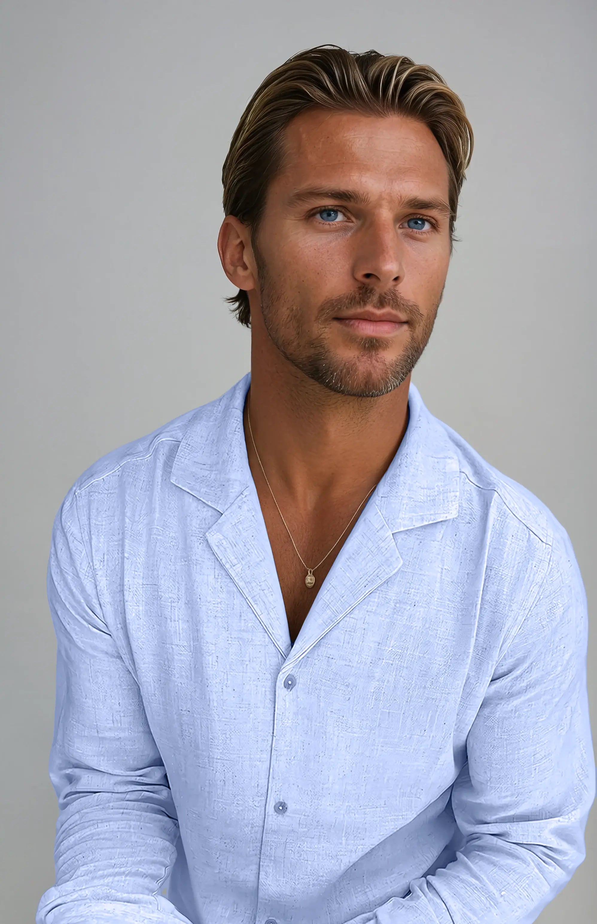 Objednajte si dnes svoju Ľanovú plážovú košeľu - Svetlo modrá od Grand Arbre a zažite dokonalú rovnováhu medzi štýlom a pohodlím!