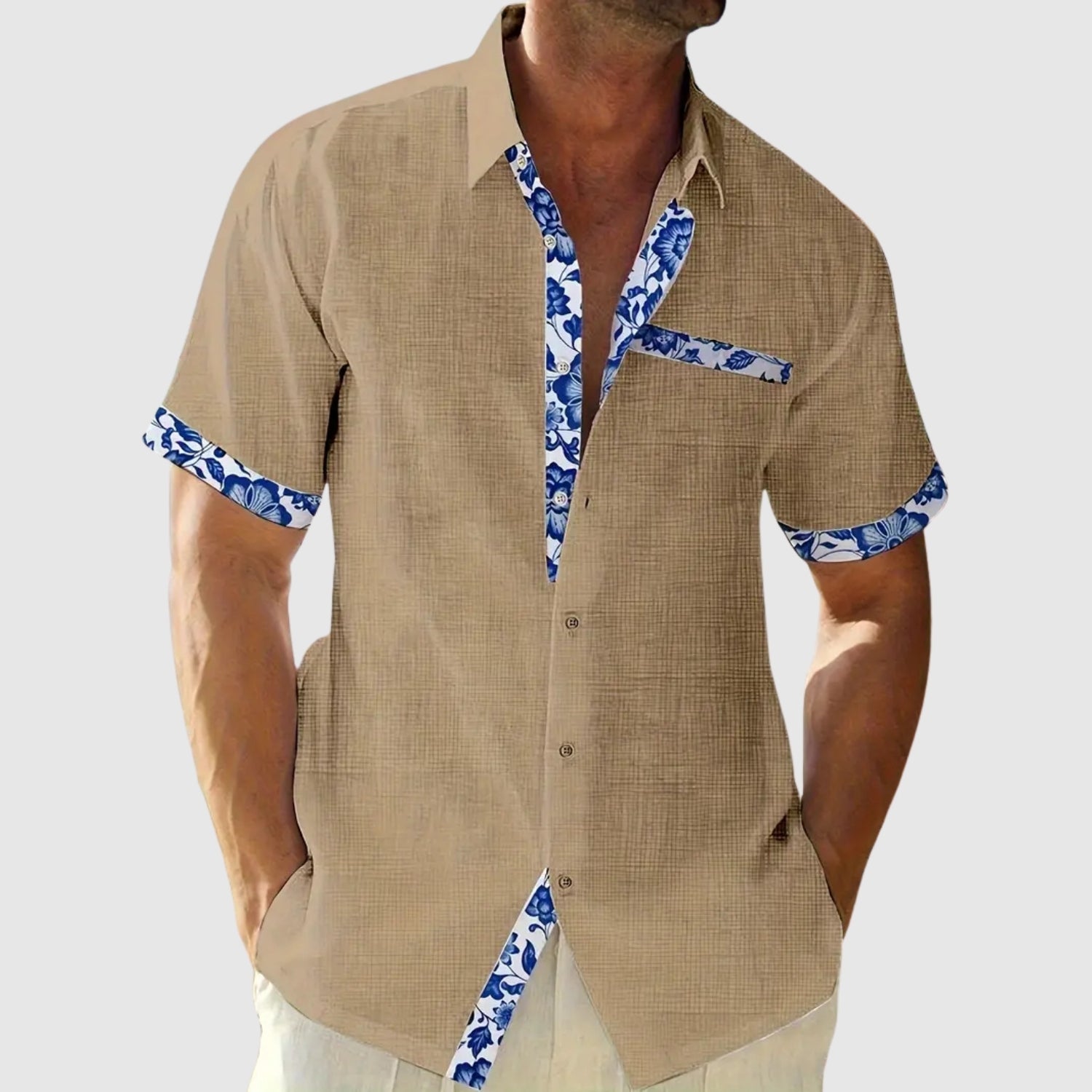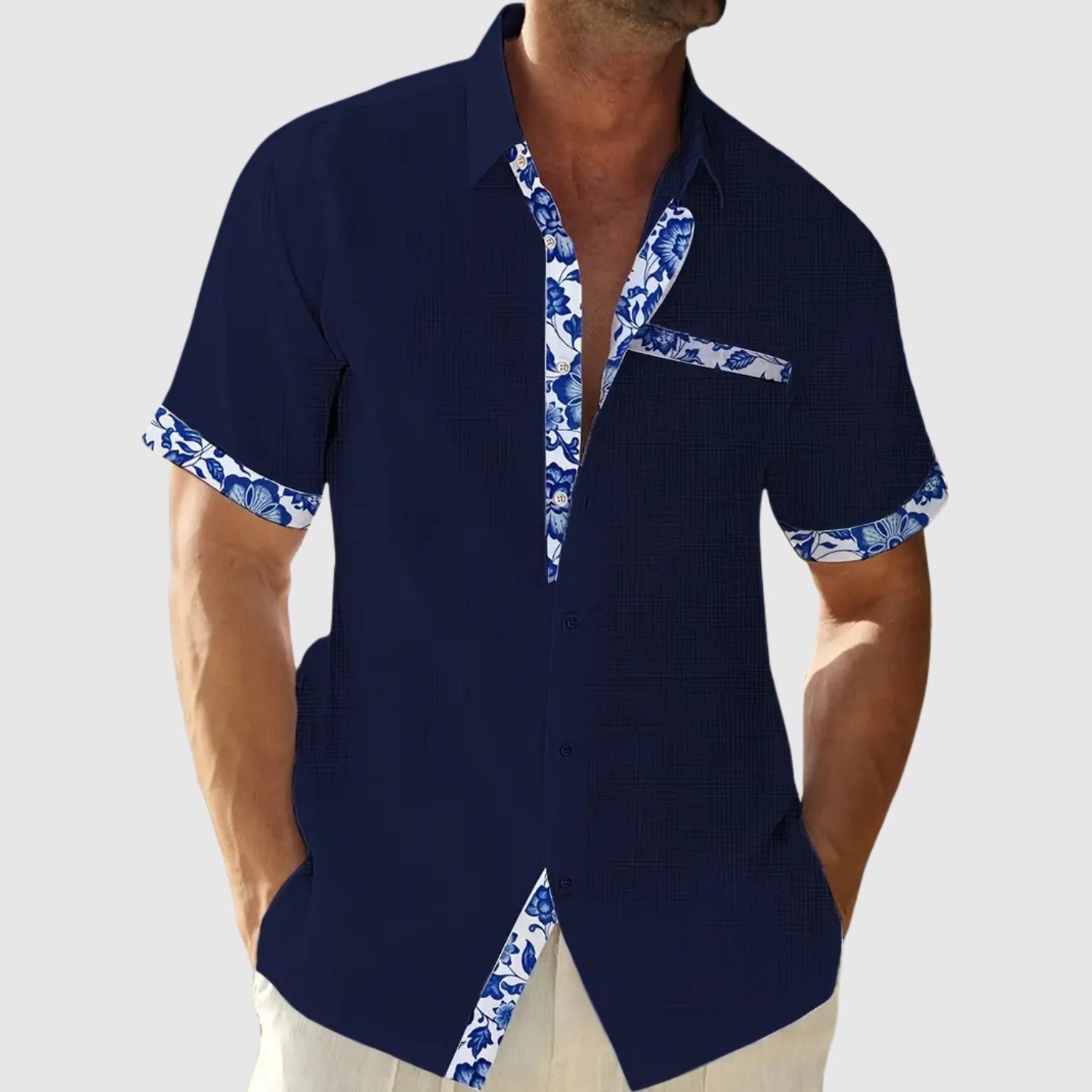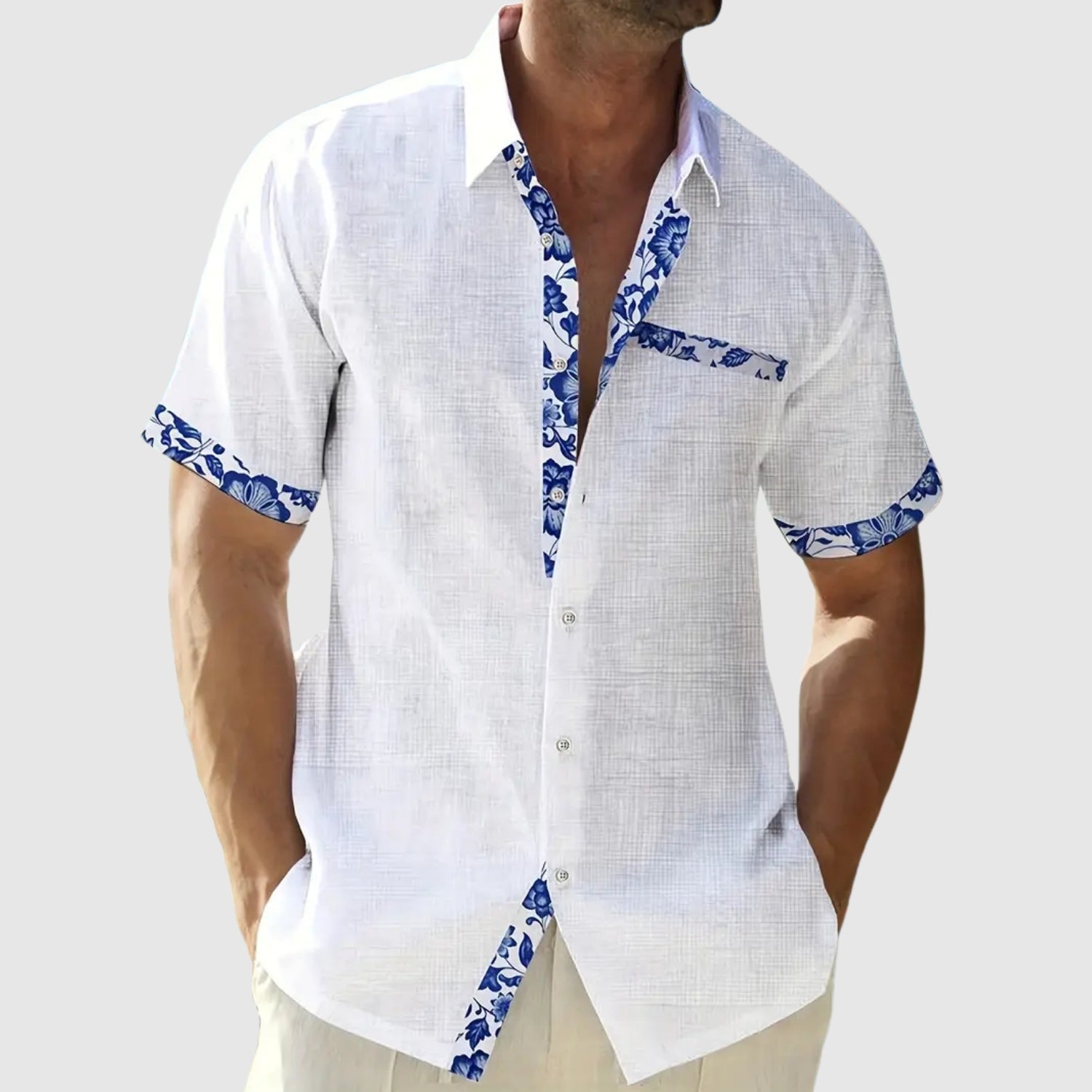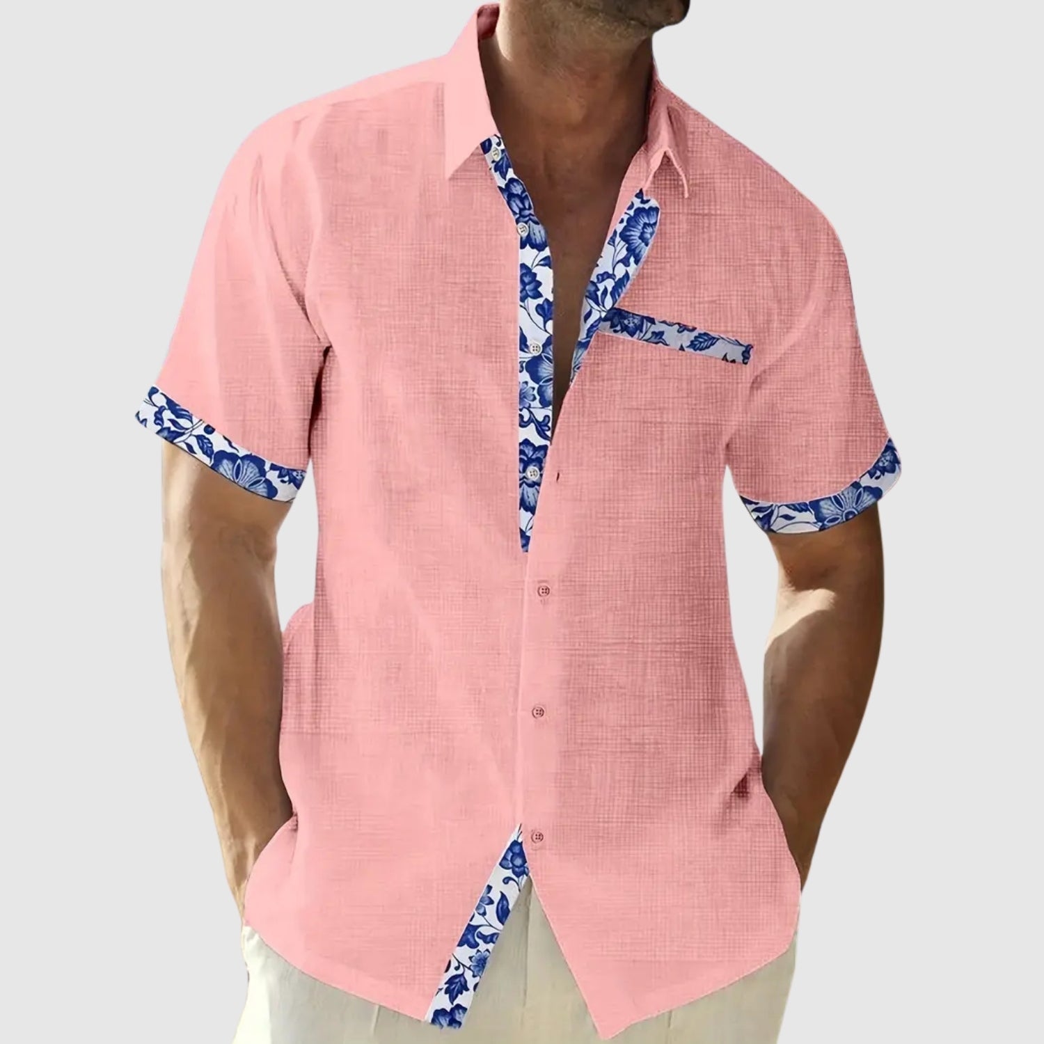 Táto košeľa s krátkymi rukávmi, navrhnutá na slnečné dni, spája sviežosť a eleganciu s nádychom živosti. Kontrastné detaily na golieri, vrecku a rukávoch pridávajú charakter neformálnemu vzhľadu, ktorý je ideálny na pláž, do mesta alebo na letnú cestu.