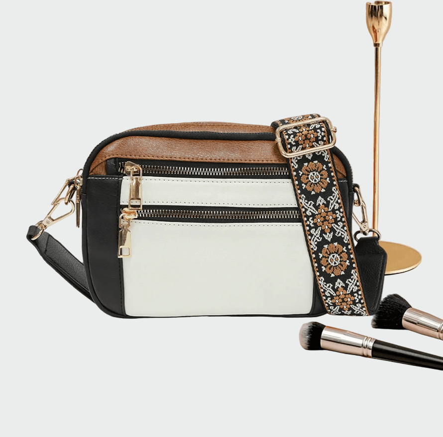 Elegantná taška cez rameno v čiernej farbe s moderným a praktickým dizajnom. Disponuje dvoma vonkajšími vreckami na zips a kovovými detailmi v zlatistom odtieni, ktoré pridávajú luxus a funkčnosť. Široký textilný remienok s pôsobivým vzorom zabezpečuje jedinečný charakter a pohodlie pri nosení. Ideálna na každodenné používanie, ale aj na špeciálne príležitosti.