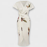 Čarovné zavinovacie midi šaty s jasným listovým potlačou a lichotivým V-krkom. Ideálne na akúkoľvek príležitosť, od brunchov po vonku konané podujatia.