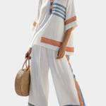 Štruktúrovaná sviežosť s morskou atmosférou. Komplet Deyzi sa vyznačuje čistým a moderným dizajnom, obohateným ručne vyrábanými detailmi v živých farbách. Široká blúzka a nohavice s širokými nohavicami vytvárajú uvoľnený siluetu, ktorá vyžaruje ľahkosť a štýl s individualitou.