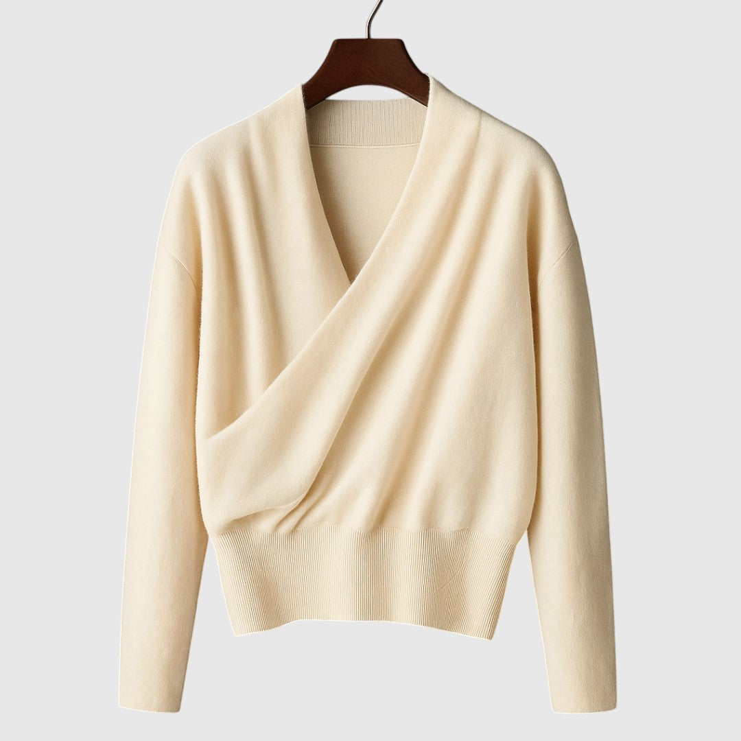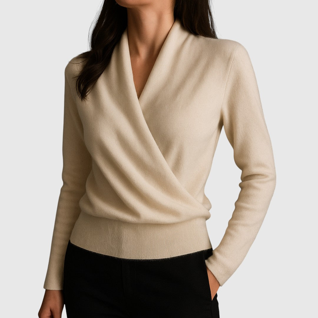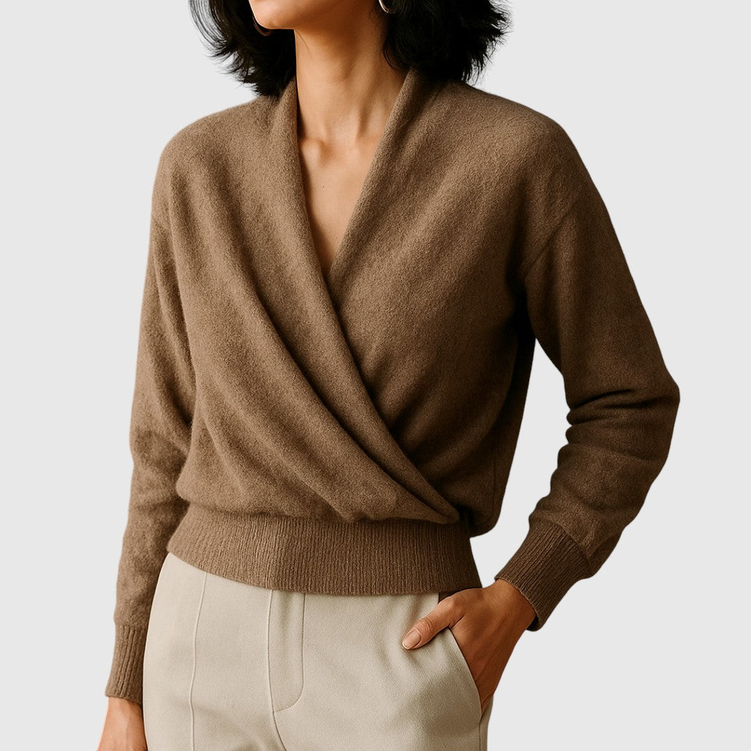 Elegantnosť, ktorá obklopuje. Elena je zavinovací sveter s V-čkovým výstrihom a krásnym padaním, ktoré opticky predlžuje postavu a zvyšuje každý outfit – od kancelárie po večeru.