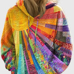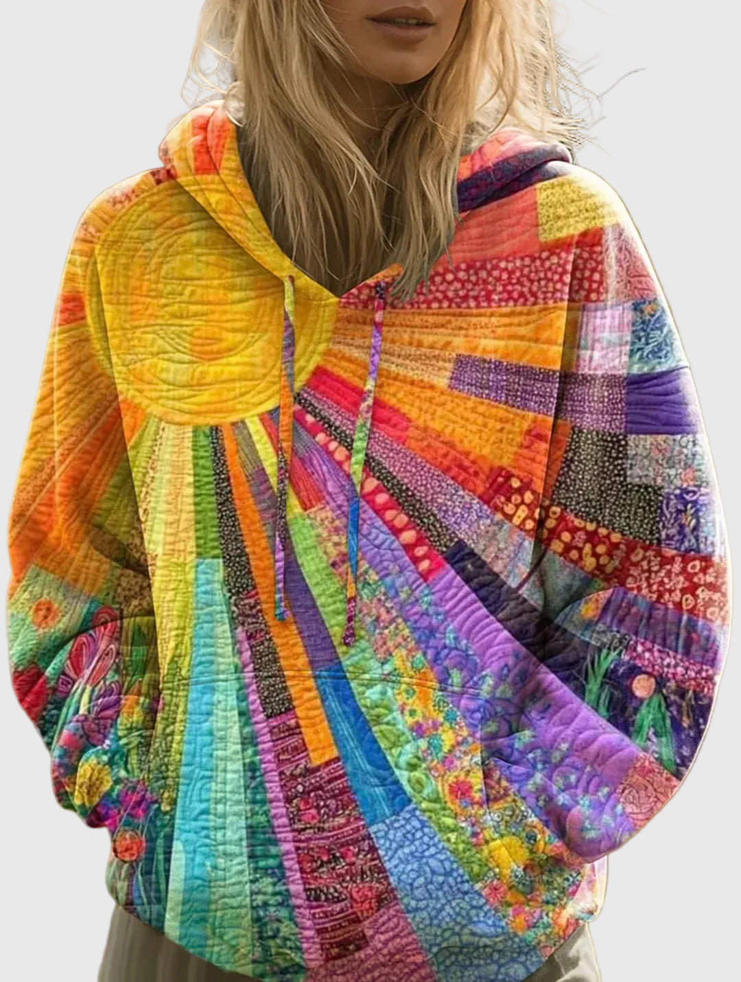 Pozdvihnite svoj každodenný štýl s touto živou mikinou, ktorá kombinuje umelecký nádych s maximálnym komfortom. Ozdobená úchvatným viacfarebným patchworkovým slnečným vzorom, vnesie do vášho šatníka bohémsky dotyk. Vyrobená z ľahkej zmesi bavlny, táto mikina je ideálna na vrstvenie alebo na to, aby sa stala stredobodom pozornosti sama o sebe.