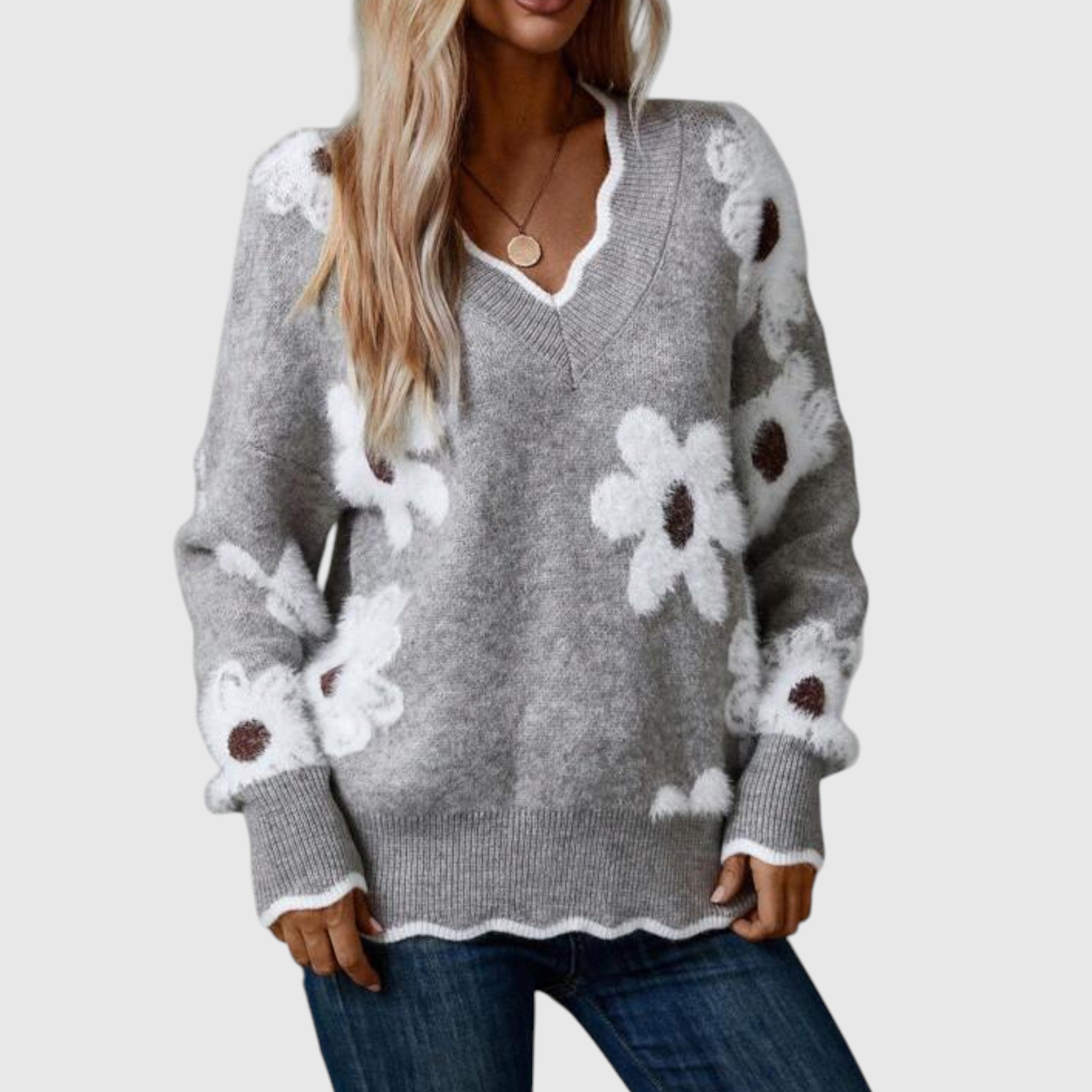 Sveter Thea spája útulný komfort s neformálnou eleganciou, čo z neho robí výnimočnú voľbu na chladnejšie dni. S lichotivým V-krkom a elegantným kvetinovým vzorom prináša šarm a rafinovanosť do vášho každodenného šatníka. Mäkký, ľahký a ľahko nositeľný, Thea vás zahreje bez toho, aby vás zaťažoval — ideálny na neformálne chvíle a elegantné príležitosti.