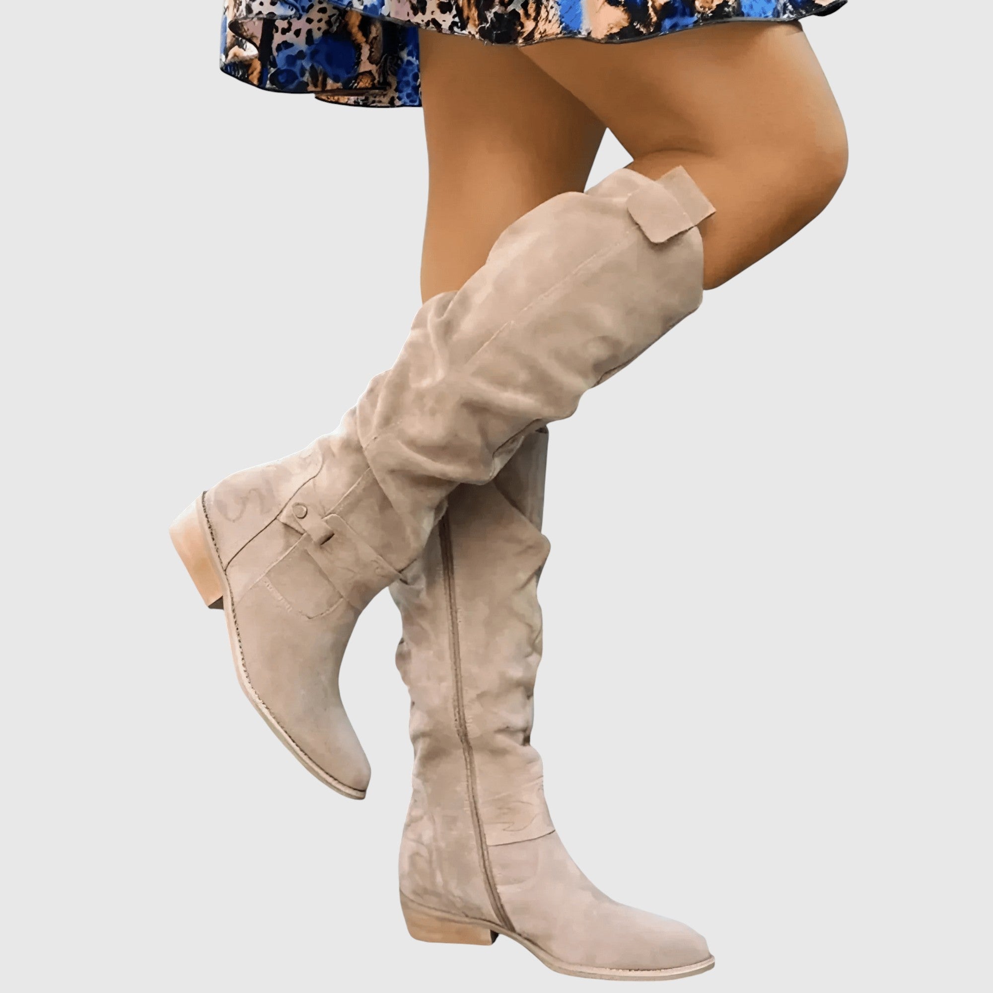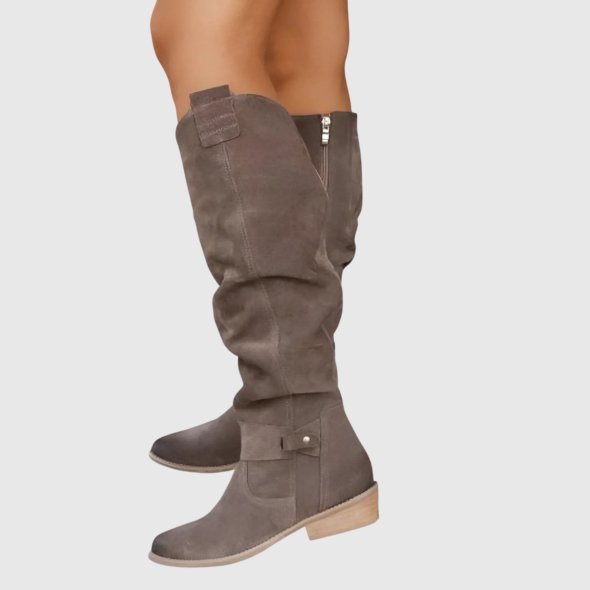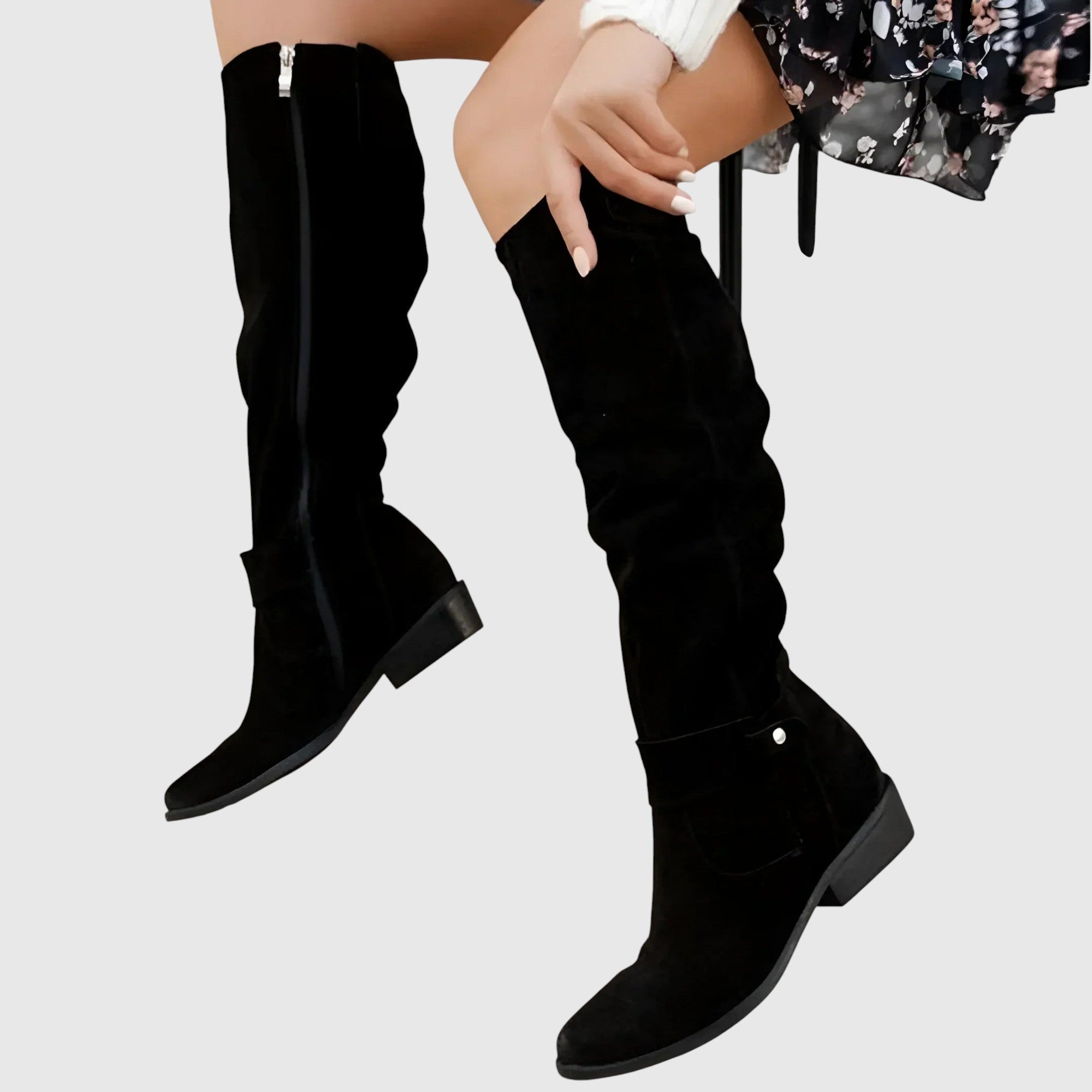 Vysoké čižmy s dizajnom „slouch“, zaoblenou špičkou a nízkym stabilným podpätkom. Ľahko sa obúvajú bez zložitých zapínaní, mäkký a elastický vrchný materiál, ktorý sa prirodzene prispôsobuje lýtku. Vertikálne švy opticky predlžujú siluetu. Perfektne sa kombinujú s šatami, sukňami a džínsami — od bežného dňa po neformálne elegantné outfity.